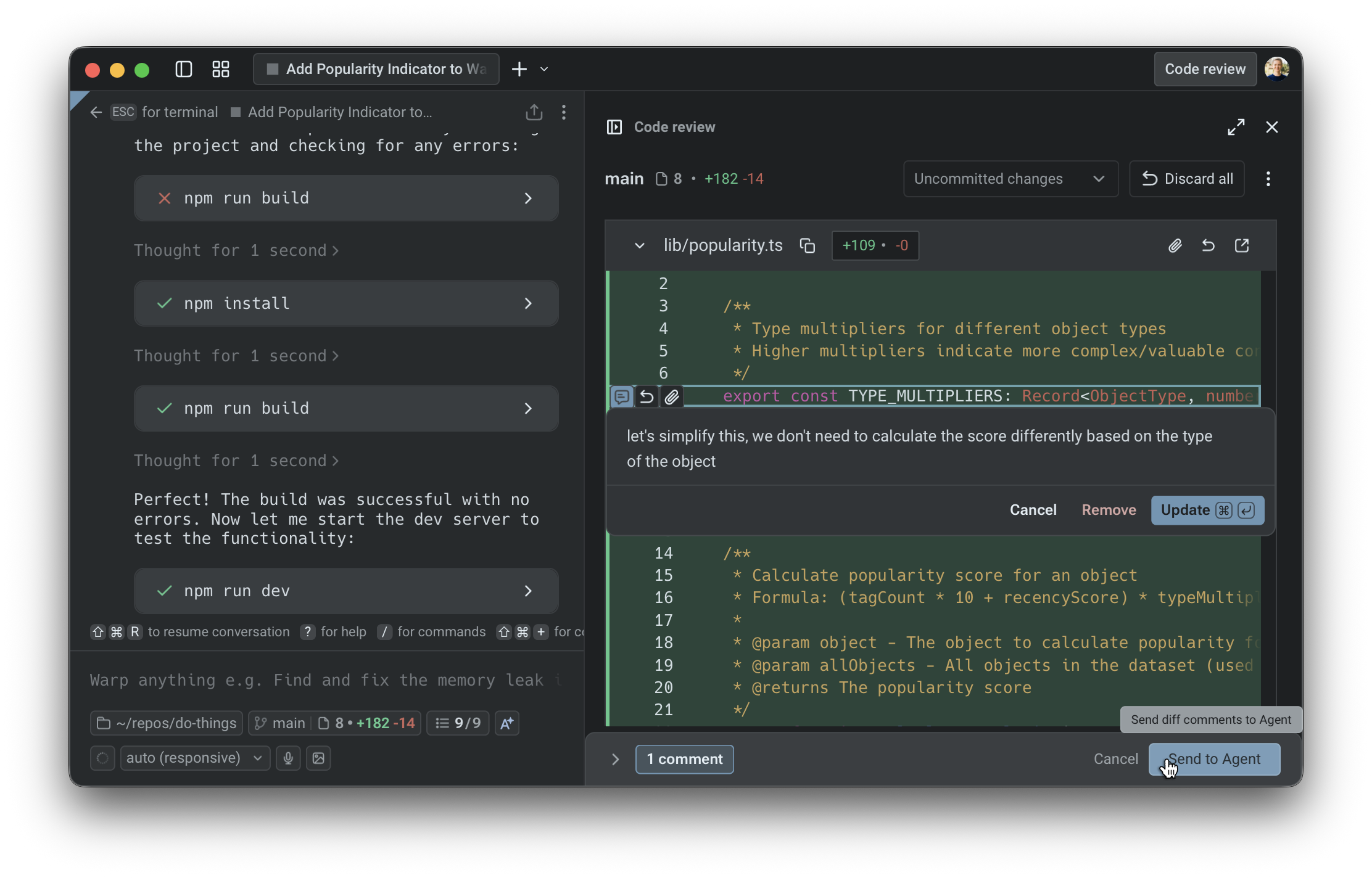 This gives you a familiar pull-request style workflow inside Warp without switching editors or tools.
